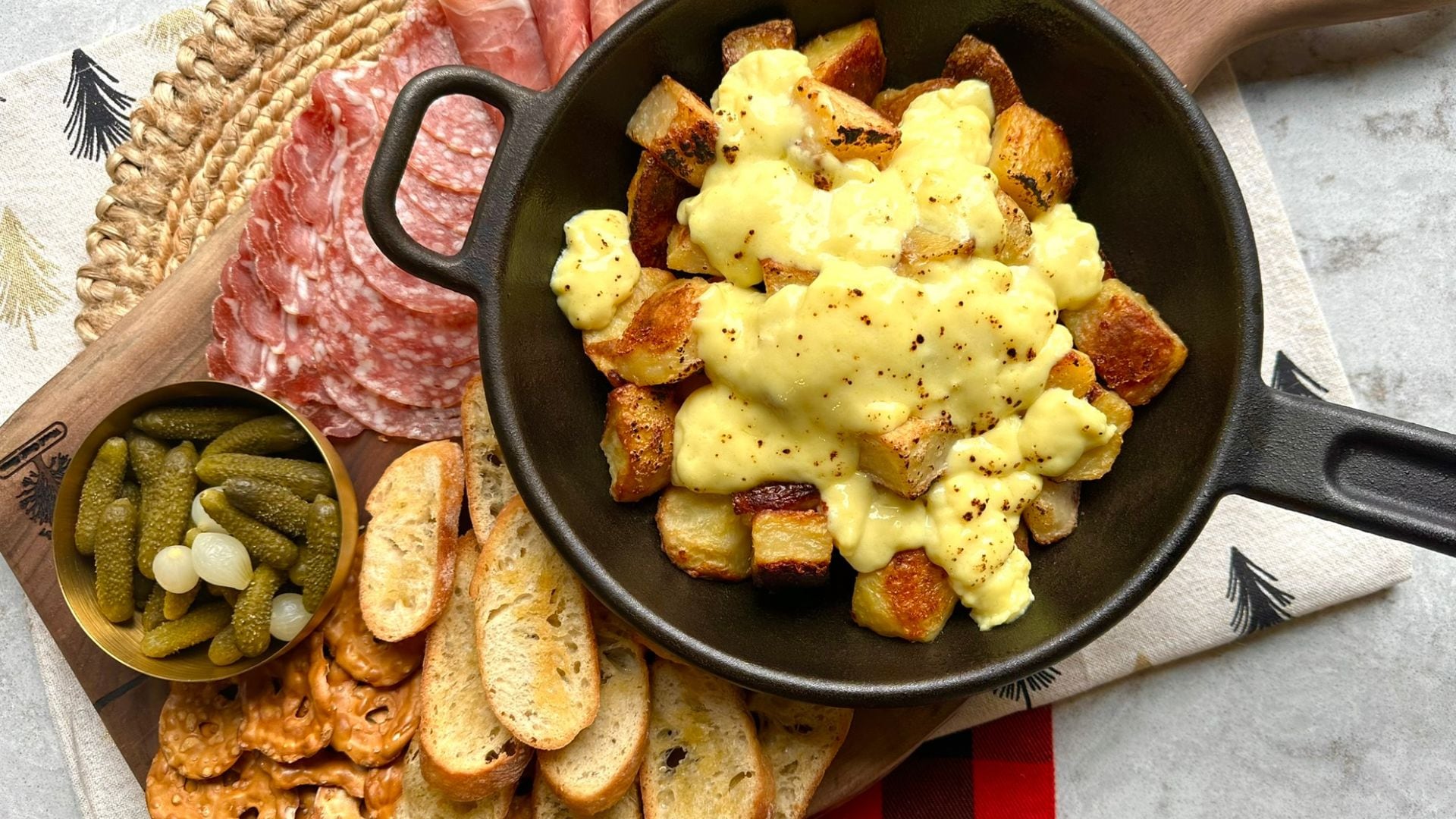 - Combine the milk, cornstarch, turmeric, and salt in a pot and heat over medium high. Whisk constantly, until the mixture comes up to a gentle simmer and begins to thicken. Whisk in the cheese until the mixture is smooth and thickened. Transfer some of the “Raclette” to a cast iron skillet (work in batches if necessary) and pop under the broiler until golden brown and bubbling. Then, drizzle on top of crispy potatoes OR serve alongside a charcuterie board with pickles and bread for dipping/drizzling. Enjoy!