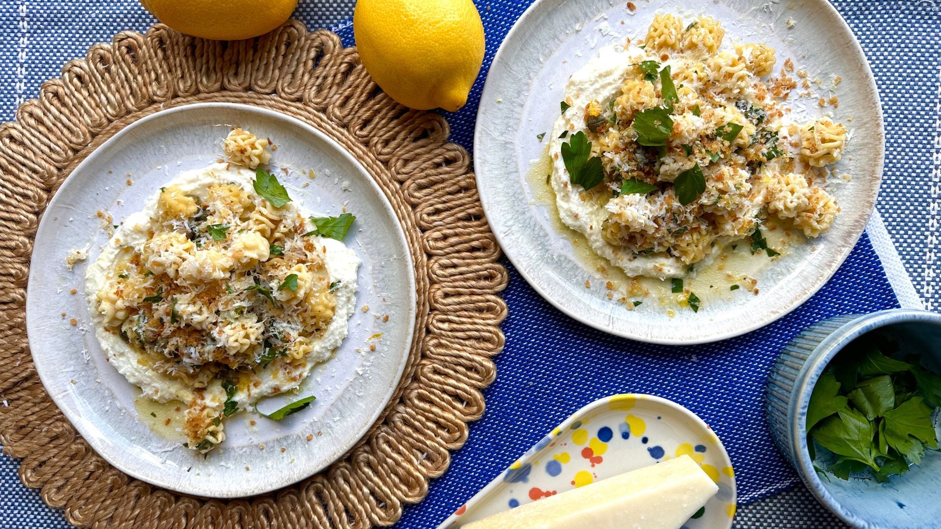 - To serve, divide the ricotta over the serving plates and spread into an even layer. Spoon over the lemony pasta and scatter with the pangrattato.