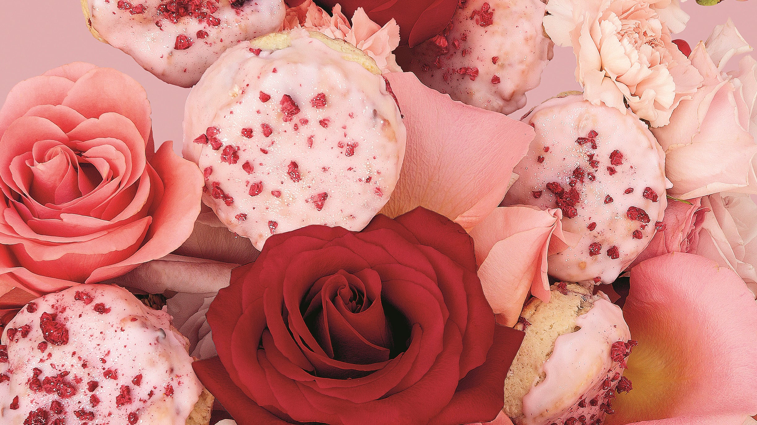 - Dip the top of each biscuit into the Rosewater Glaze. Hold the biscuit over the bowl and gently shake until the glaze no longer drips off. Return to the baking sheet and garnish immediately with freeze-dried raspberries, crushing them between your fingers as you sprinkle, and glitter.