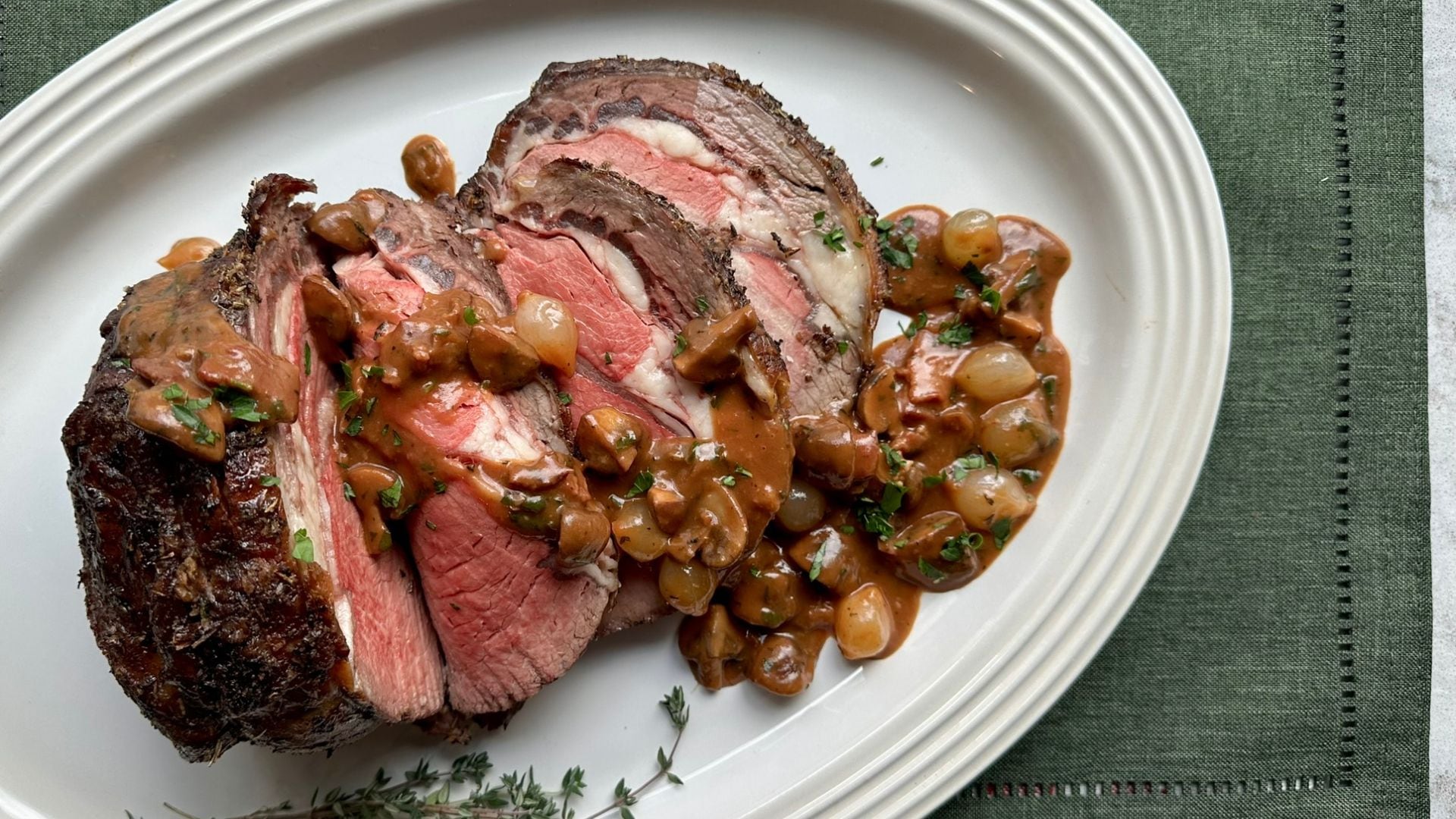- When the timer or thermometer goes off, remove the roast from the oven. Cut off the ribs, if using a bone-in roast, and slice. Like with a reverse-sear method, this oven-off cooking method does not require resting the roast before serving. Serve the roast topped with the bourguignon sauce.