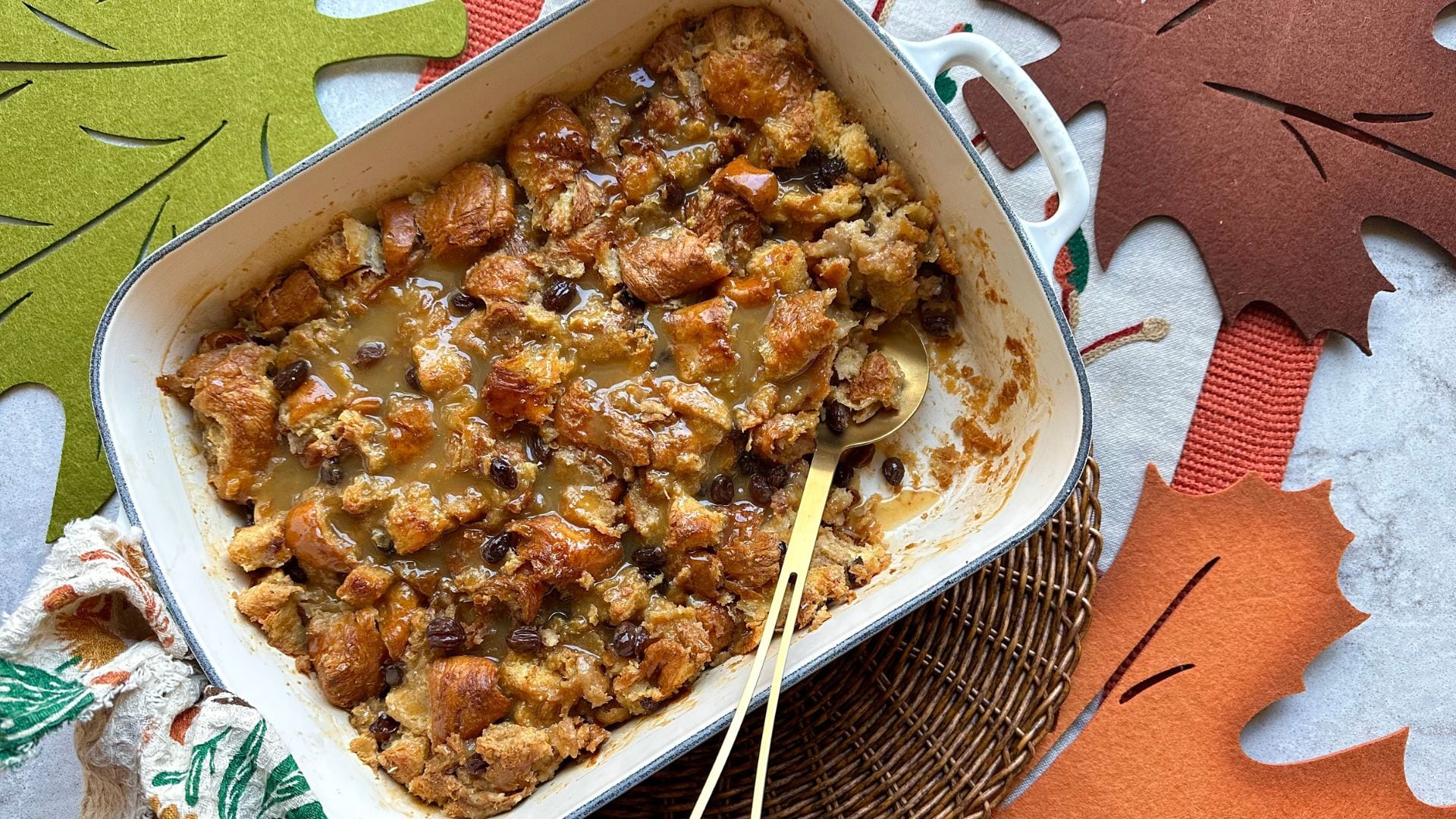- Add croissant and brioche pieces to the baking dish and scatter soaked raisins and any leftover rum evenly over the bread.