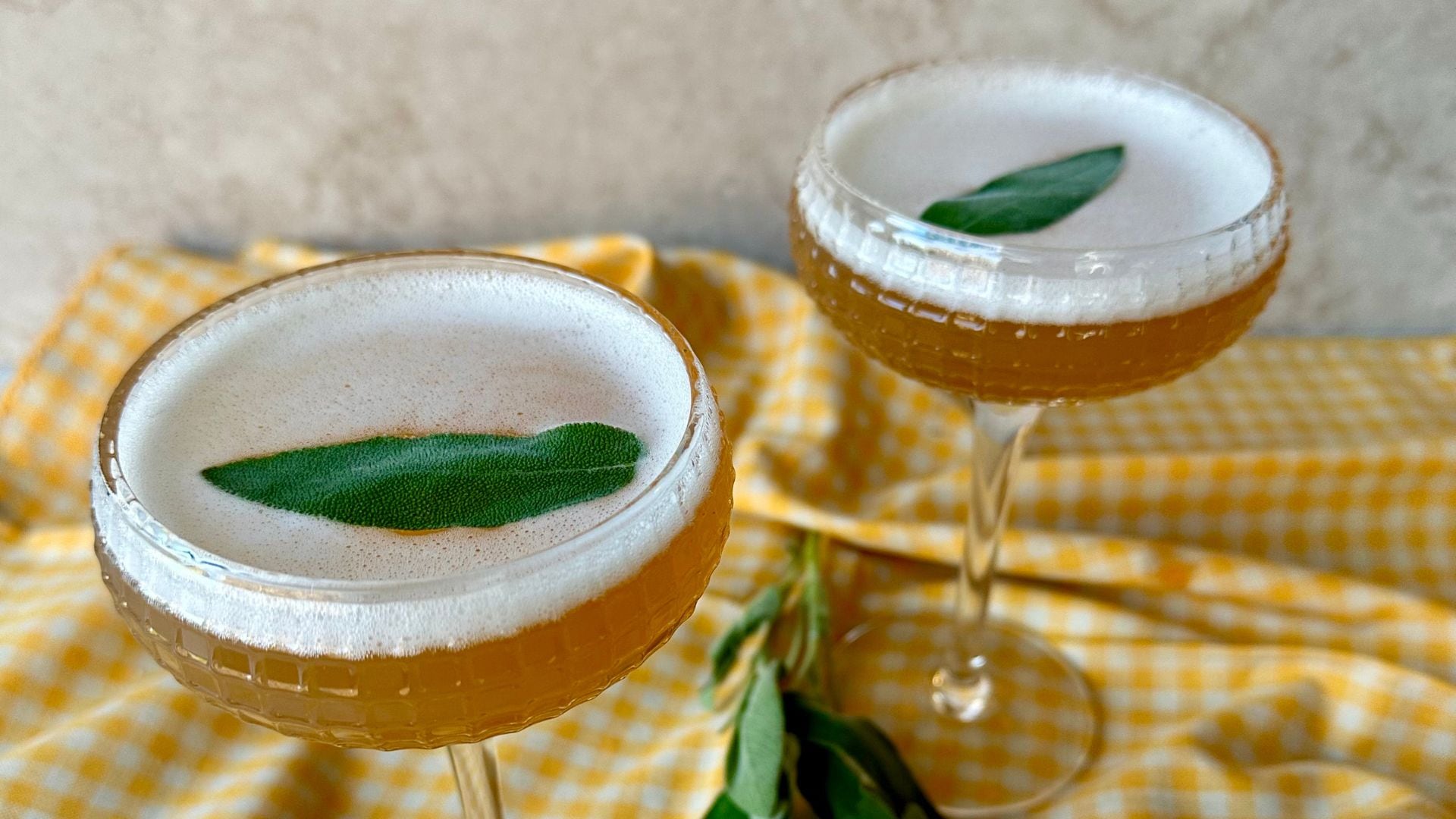 - Shake all ingredients and strain into a coupe. Garnish with sage