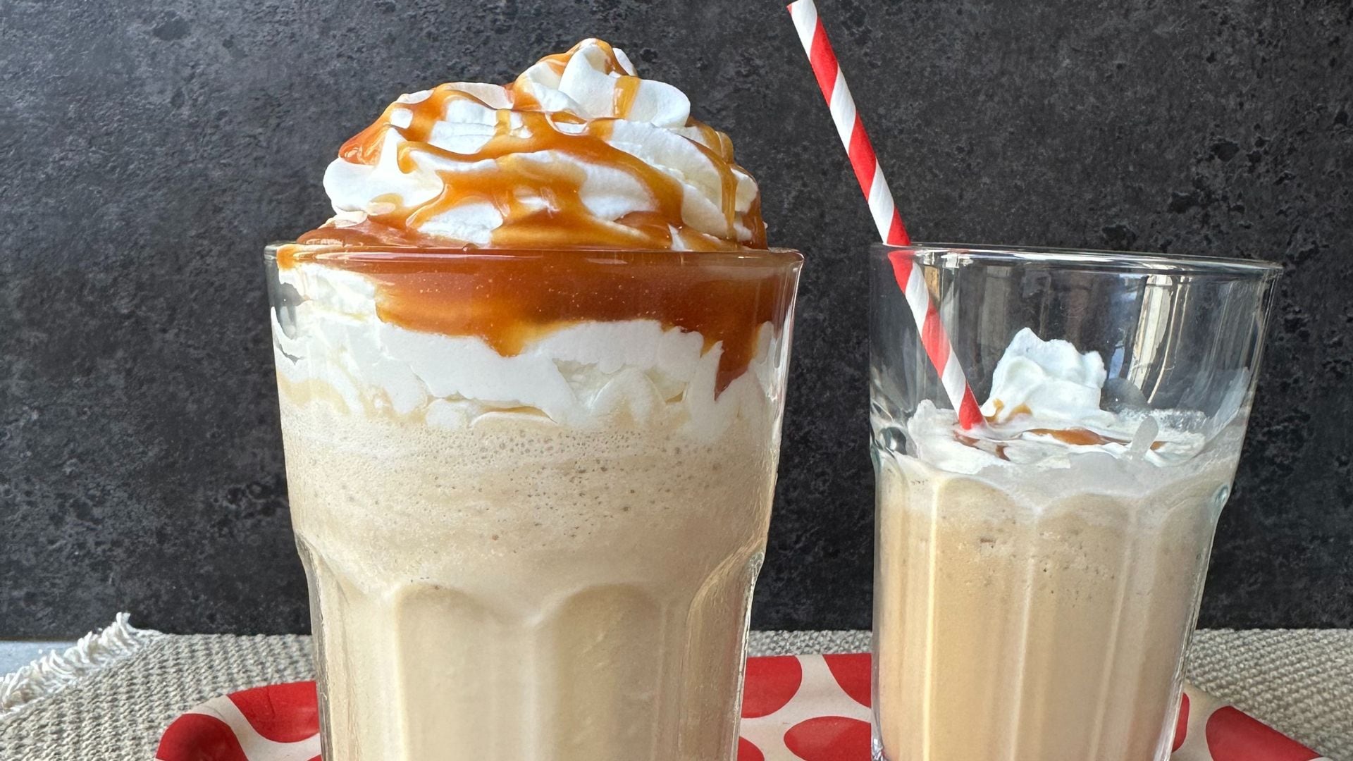 - To assemble the drink, add the ice, coffee, table cream, and ⅓ of the salted caramel to a blender. Blend until smooth, then pour into a glass. Garnish with whipped cream and more salted caramel.