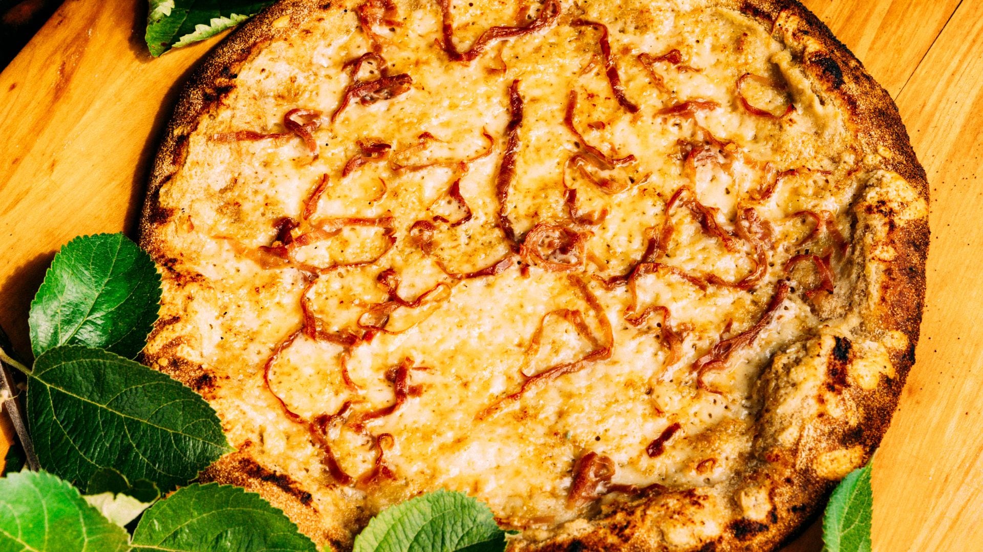 - Add a piece of fuel to the embers, waiting for tongues of live flame to lick the ceiling before firing the pizza. This balances the intense retained heat in the oven floor with equally fierce heat above so the dough and toppings cook together. Pick up the pie and transfer to the floor of the wood oven, releasing with a quick reverse snap. Position at least 8” inches from the ember pile. Bake, rotating once, until the bottom is golden brown, the edges crusty and lightly charred, and the cheese lightly browned and bubbling, as little as 2 minutes, but no more than 5 minutes. Often the first pie of any pizza baking rally is a calibration effort as the full heat of the oven reveals itself to the baker.