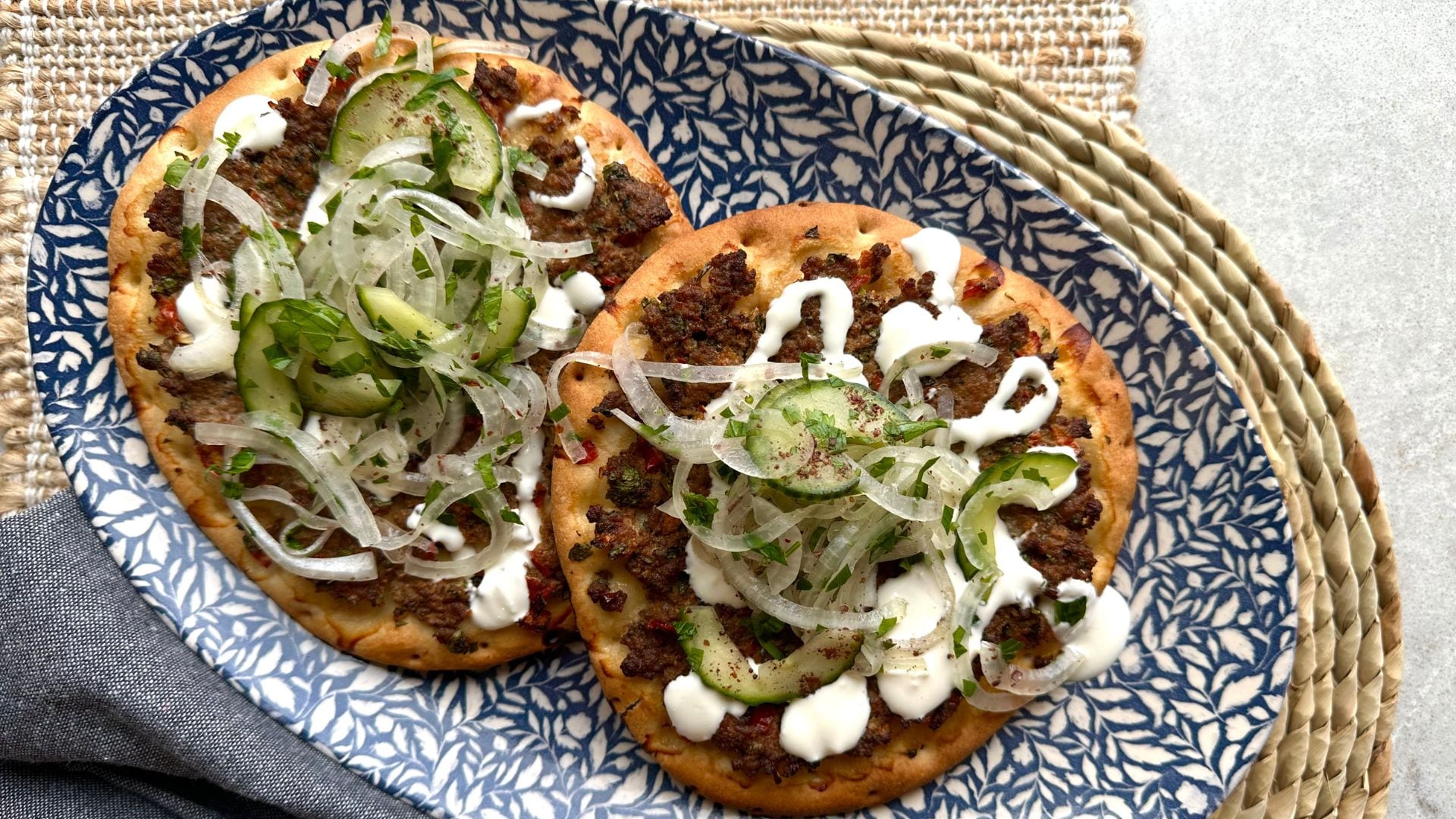 - Place the pitas, lamb side up, on a lined baking sheet. Bake for 12-15 minutes or until the lamb has cooked through and the pita is golden and slightly crisp.