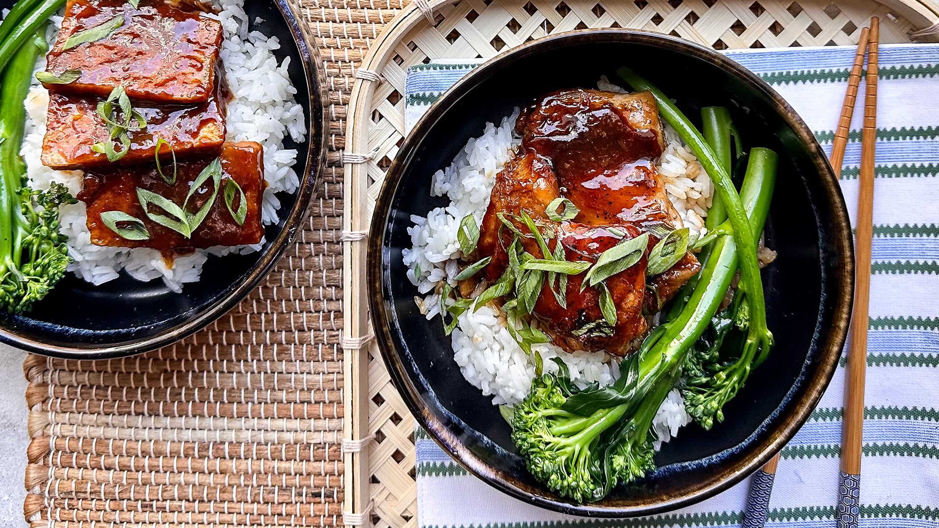 - To serve, divide the rice into serving bowls and add on the broccolini. Slice the chicken and divide into the bowls and pour over some of the reserved teriyaki sauce. Serve scattered with thinly sliced green onions.