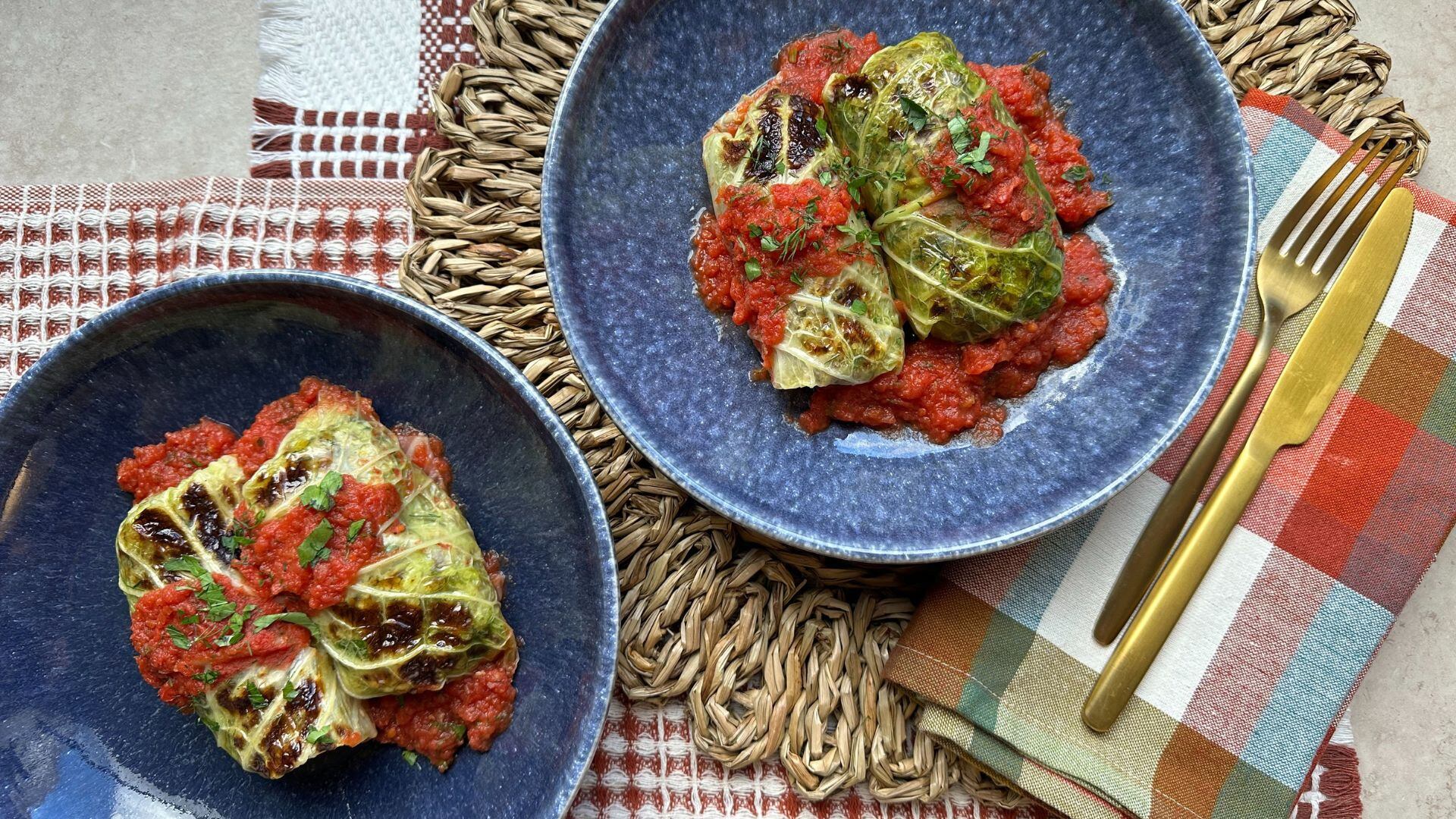 - Working with one cabbage leaf at a time, scoop about ½ cup of the rice filling onto the cabbage and tightly roll, tucking in the edges and any filing that escapes. Place the roll into the prepared pan, seam side down, and continue until all the cabbage and filling is used. If prepping ahead and making four separate pans, each pan should have four rolls. Pour the remaining sauce over the cabbage rolls.