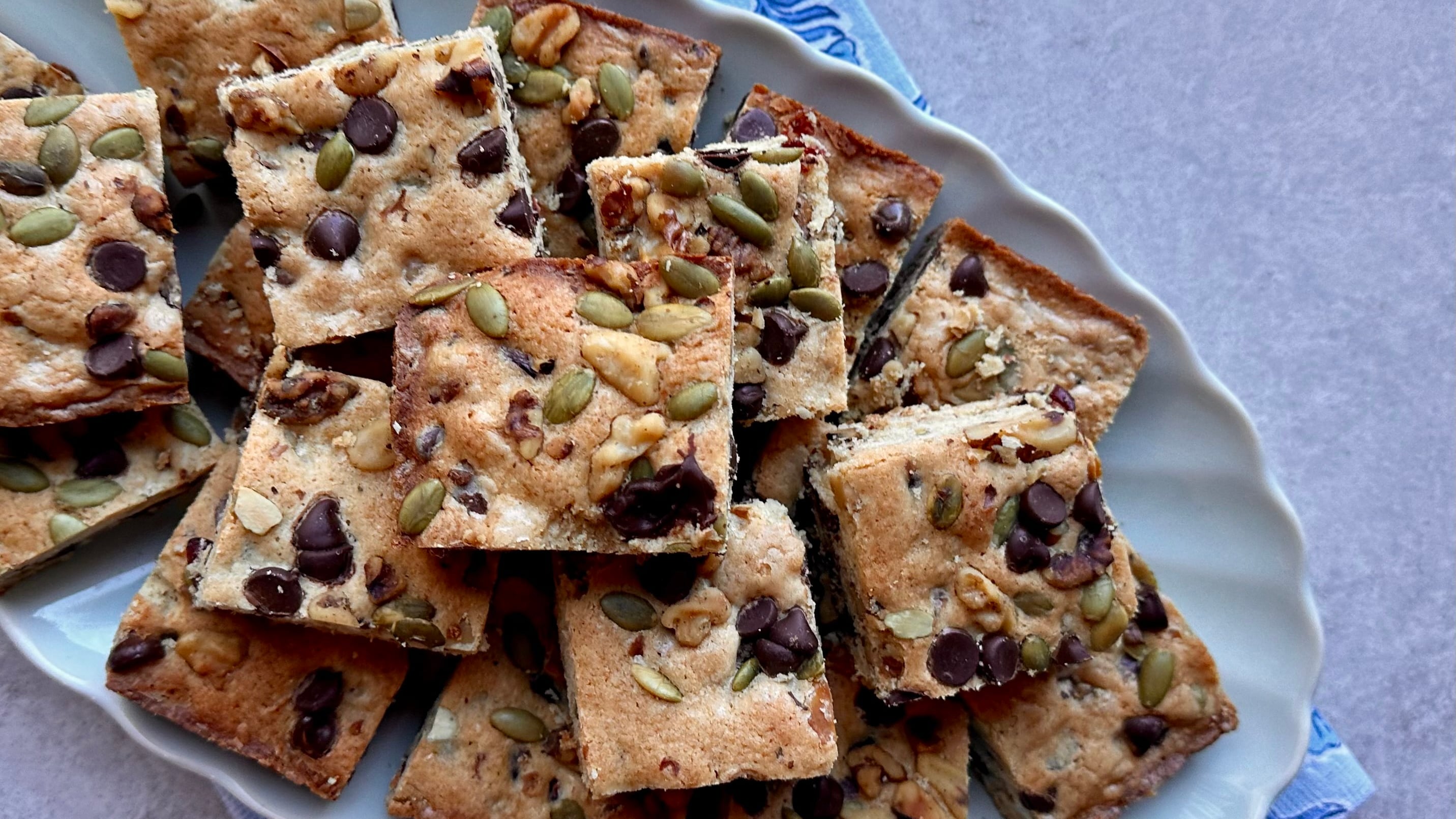 - Transfer the batter into the prepared baking pan. Using a slightly damp hand, evenly press the mixture so that it fills the whole pan. Scatter the reserved nuts, seeds, and chocolate chips over top, pressing them gently into the batter so the toppings stick.
