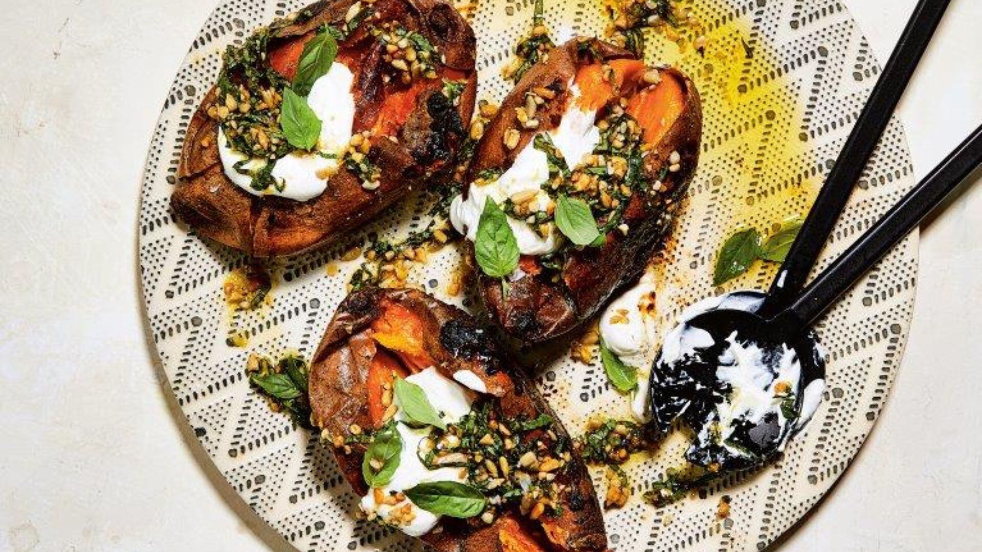 - To serve: Split each sweet potato down the middle and fill each half with 2 tablespoons of the Lemony Sour Cream and 2 tablespoons of the Gremolata. Finish with a sprinkle of the sea salt and garnish with the small basil leaves. *Note: go with the smallest sweet potatoes you can find - they’re sweeter and easier to cook evenly.