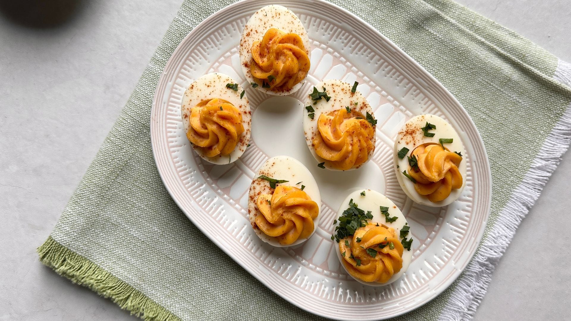 - Use a spoon (or piping bag with a star tip if you’re feeling fancy) to fill each divot in egg whites with about 1 ½ tsp of the yolk mixture, then garnish each with a shake a paprika and sprinkle with parsley. Enjoy!