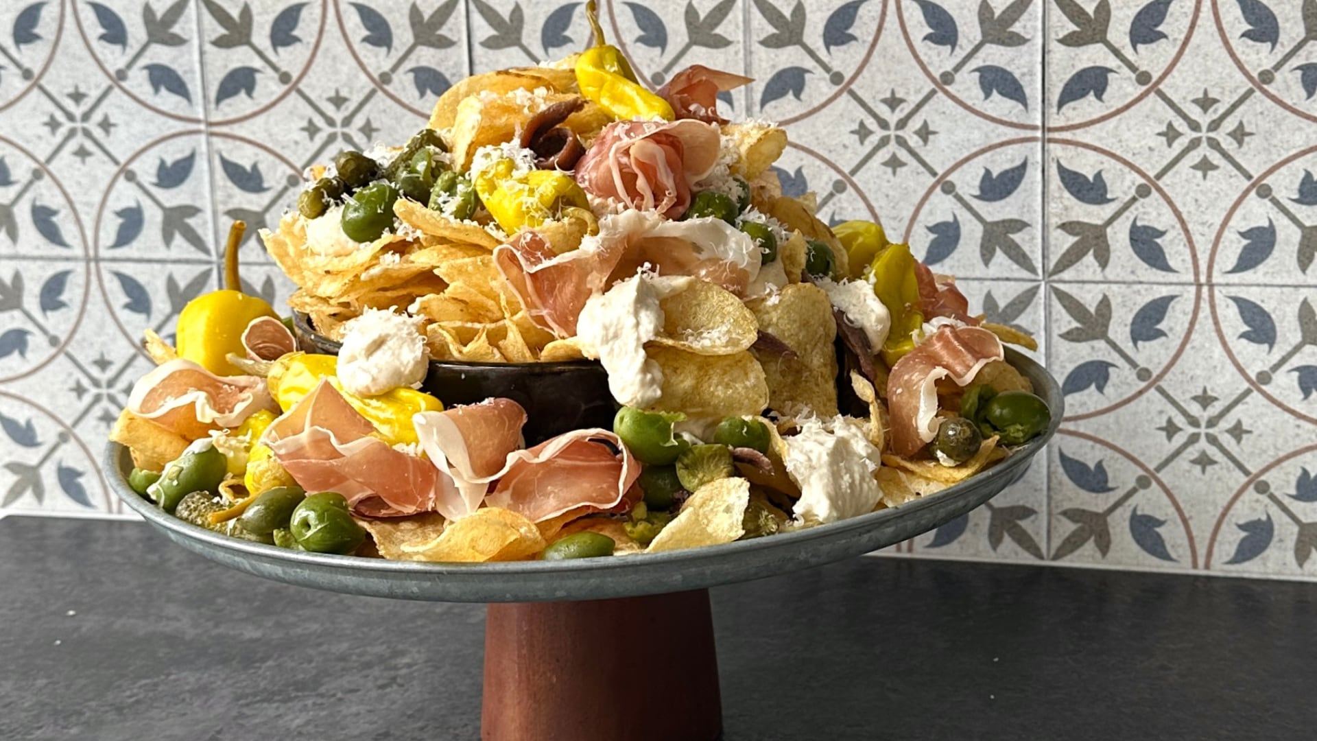 - Dollop/drizzle some of the caesar cream over the chips. Then garnish with the olives, salami, pepperoncini, cornichons, and anchovies. Lastly, grate the parmesan over the surface.