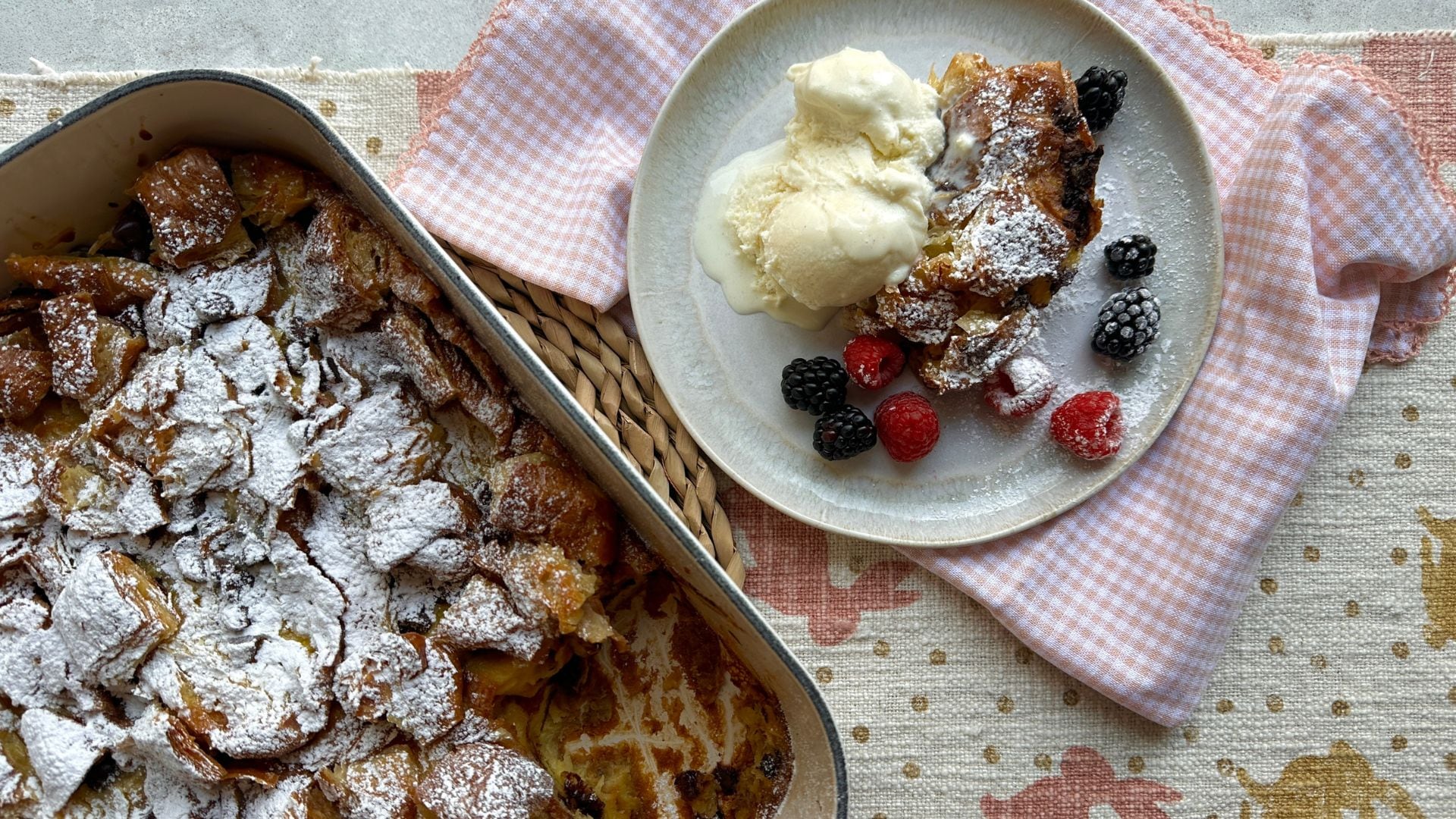 - Scatter over the pudding. Leave the pieces loose so they bake into crispy golden peaks.