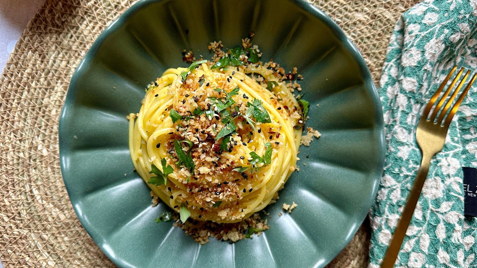 - Plate the pasta and serve immediately topped with the crunchy topping and more freshly ground black pepper.