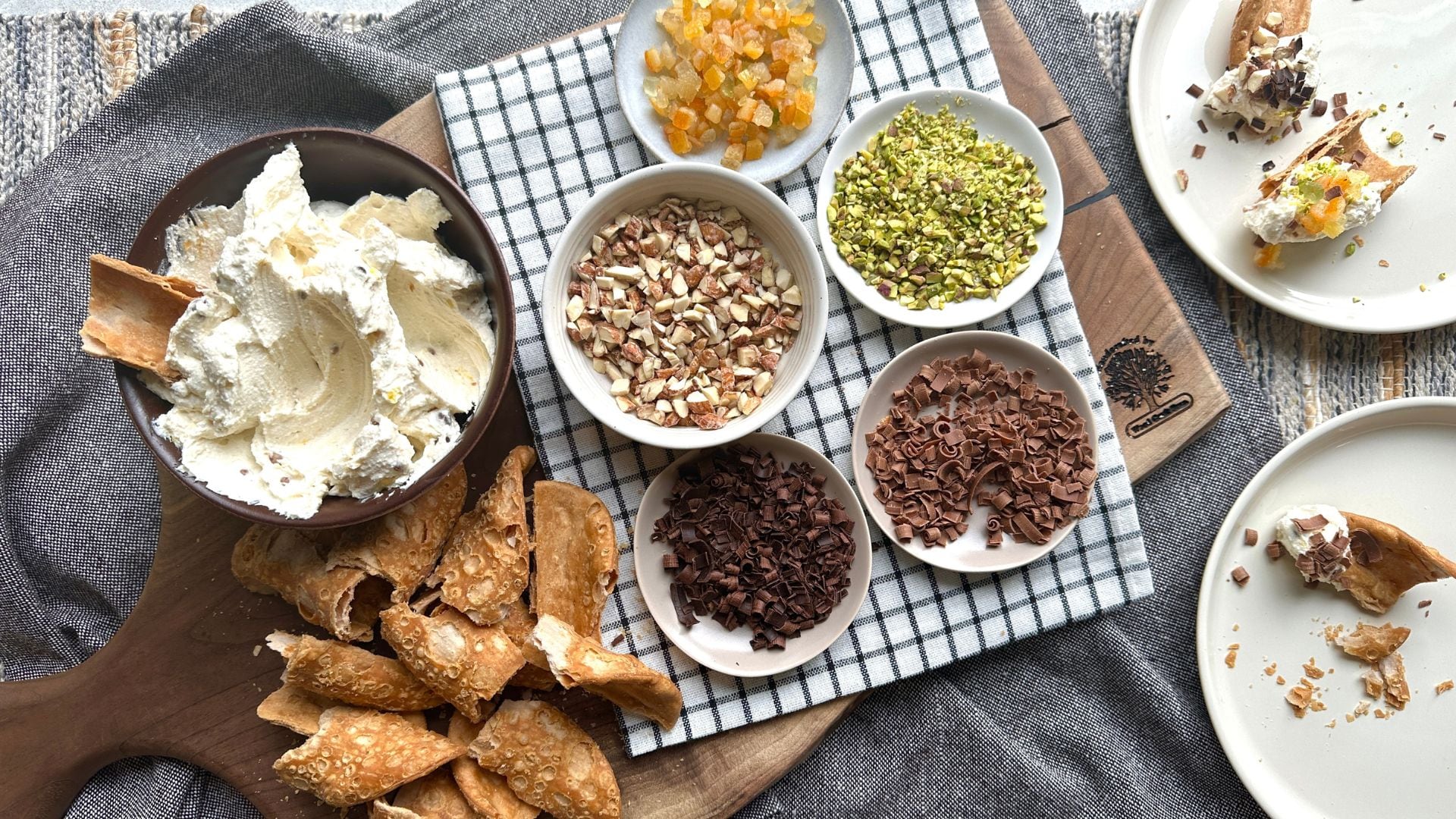 **The idea is to add the cannoli mixture to the broken cannoli shells and then to dip into your favorite garnishes on the board