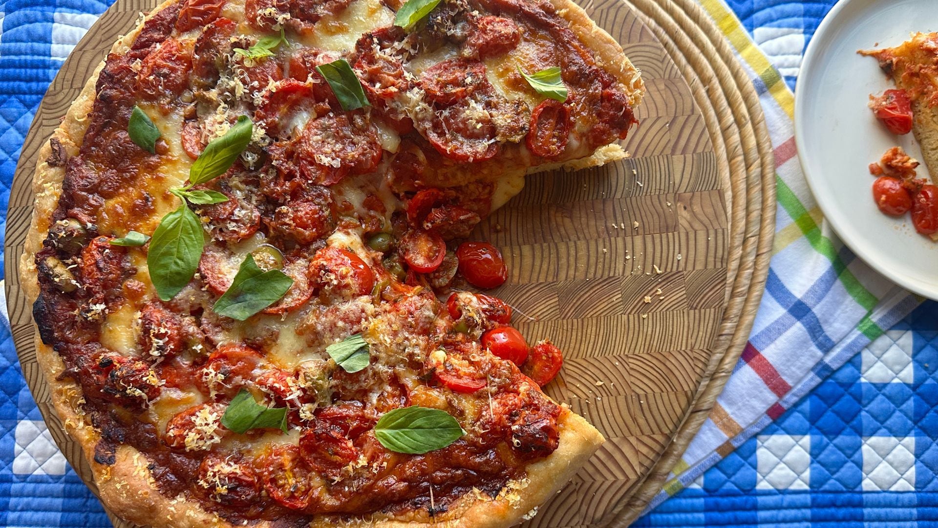 - Bake about 25 minutes, until the filling is bubbly and golden brown. Carefully lift the pizza out of the pan and onto a rack. Let the pizza cool for about 15 minutes before slicing. Garnish with fresh basil.