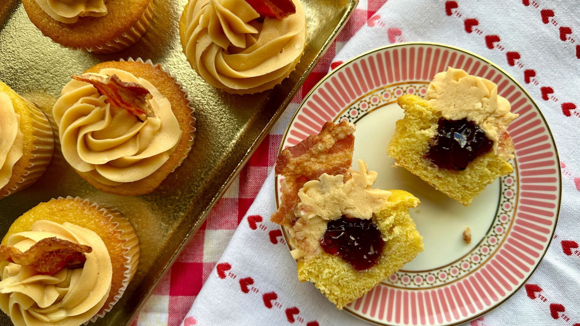 - To decorate, use a teaspoon to scoop a little well out of the centre of each cupcake. Fill the cupcakes with about 1 ½ teaspoons of grape jelly then pipe or spread the frosting overtop. Garnish each cupcake with some bacon and enjoy.