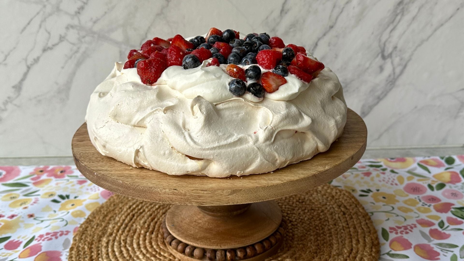 - Place the pavlova on a cake pedestal. Top with the whipped cream and spread to the edges of the well. Mound all the berries on top.