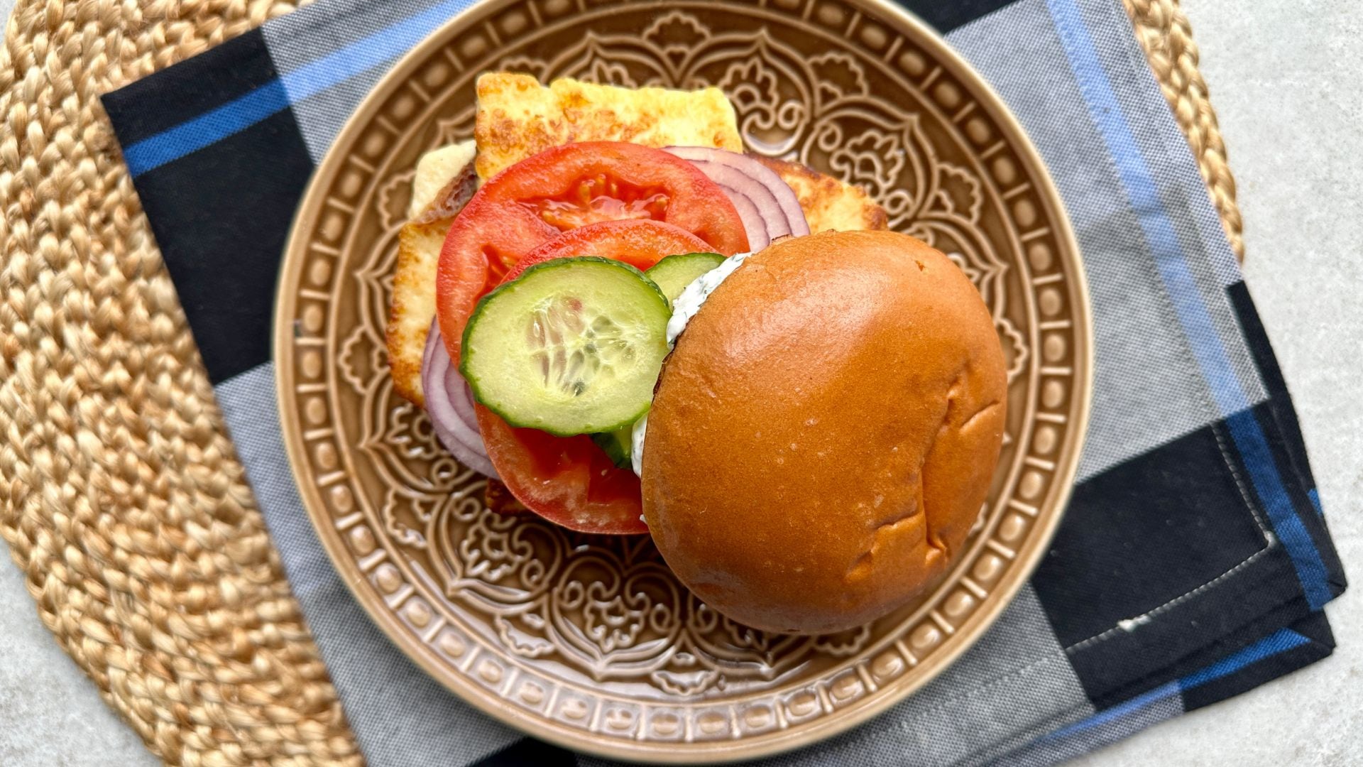- 2 x thick slices of halloumi seared (35gr each slice)