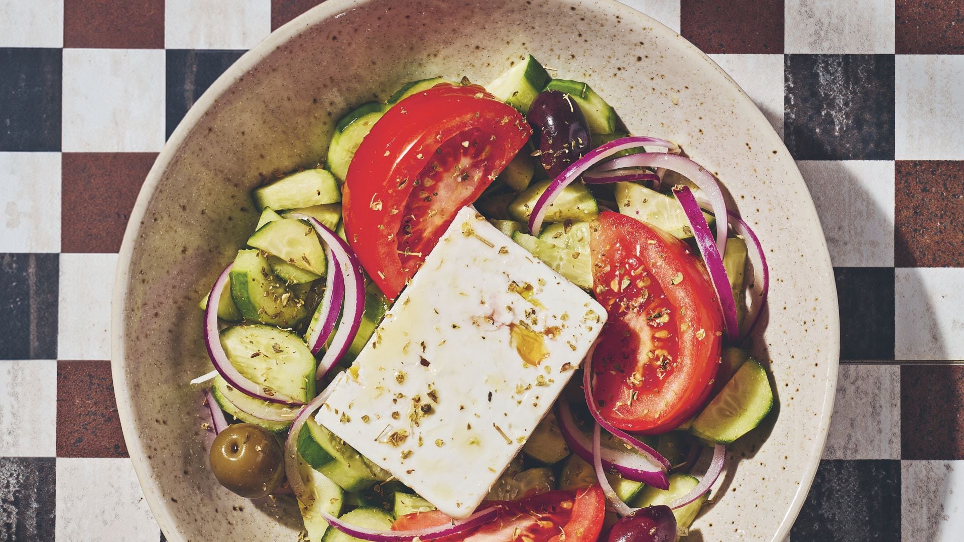 - In a large (preferably cute) serving bowl, combine the tomatoes, onion, cucumbers, olives, and capers (if using). Place the large block of feta aesthetically on top.
