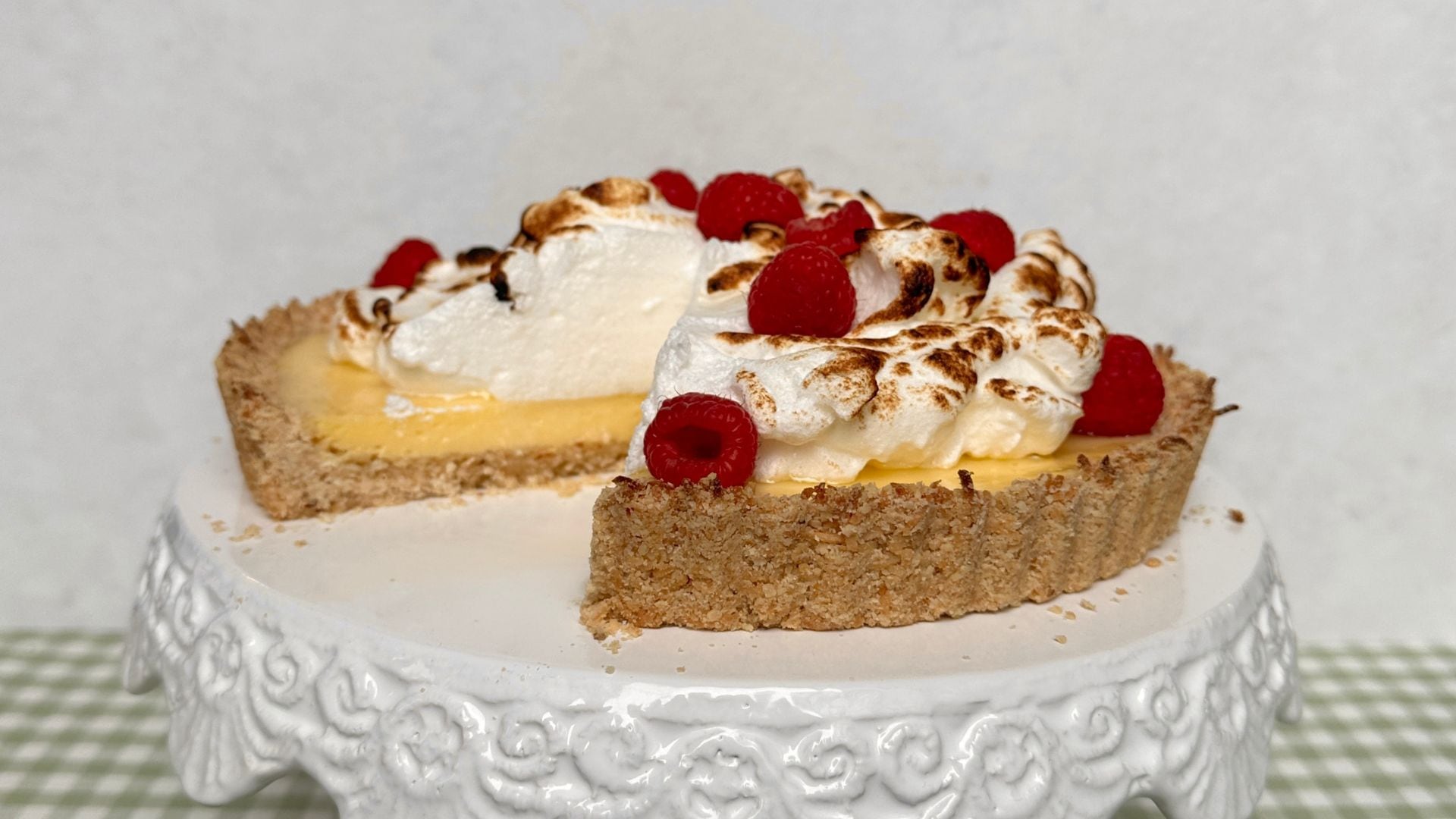 - In a medium bowl (btw you should be rinsing and reusing the same medium bowl each time), whisk the egg whites until foamy, then slowly add in the sugar. Continue whisking until stiff peaks form (can also do this with a hand mixer), then pour onto the baked, cooled pie. Turn the broiler setting on in the oven, then broil for about 30 seconds, or until meringue slightly browns. Let your gorgeous tart cool for 1 hour. Garnish with raspberries, slice and serve.