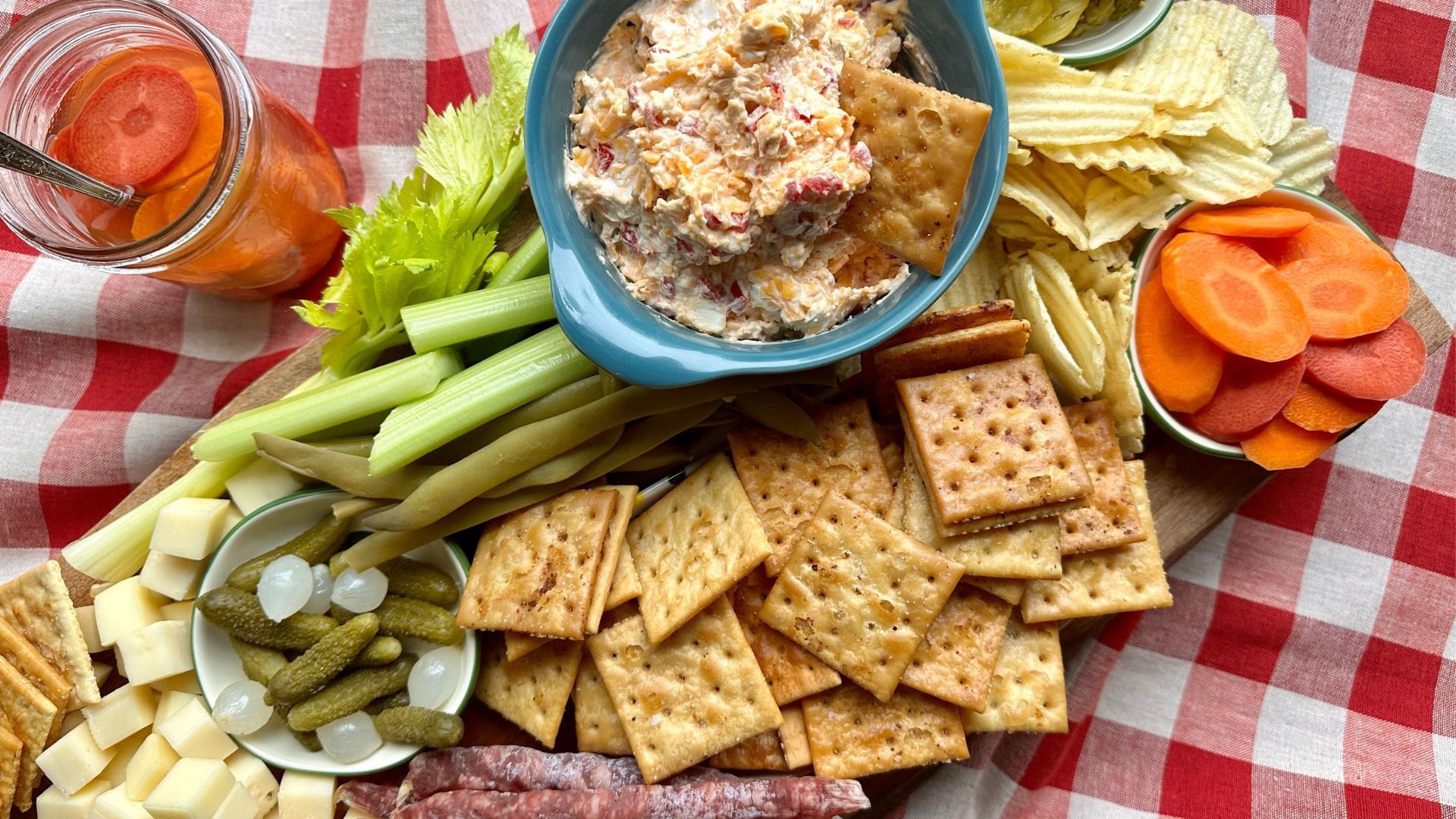 - For the pimento cheese, add the cream cheese, mayonnaise, cheddar, roasted red peppers, jalapenos, garlic powder, onion powder, and cayenne pepper to a large bowl and beat well with a hand mixer to combine. Transfer the pimento cheese to a serving bowl and place in the fridge until ready to serve.