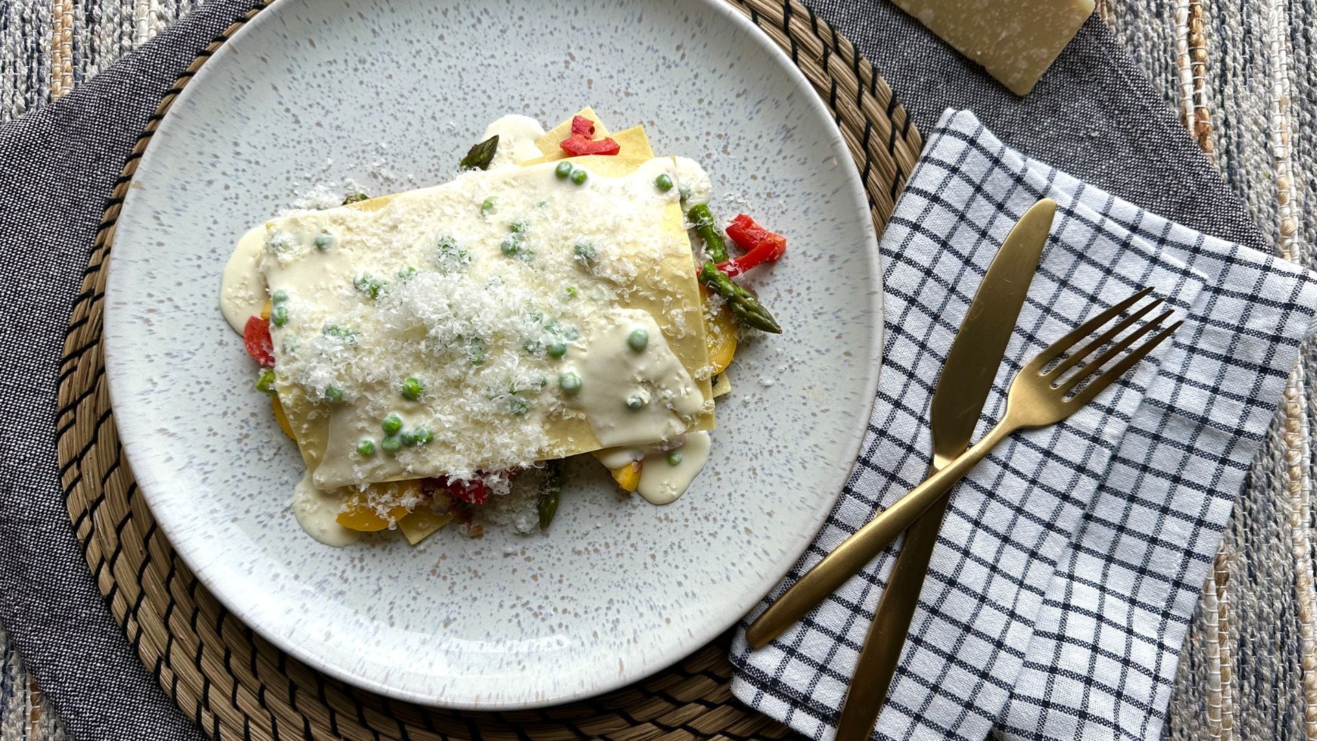 - On a large dinner plate, add 1 lasagna sheet to the base of the plate then add half vegetable mixture onto lasagna sheet, spreading evenly, top with 1 more lasagna sheet and then add remaining vegetable mixture onto the second lasagna sheet and finally add the 3rd lasagna sheet on top.