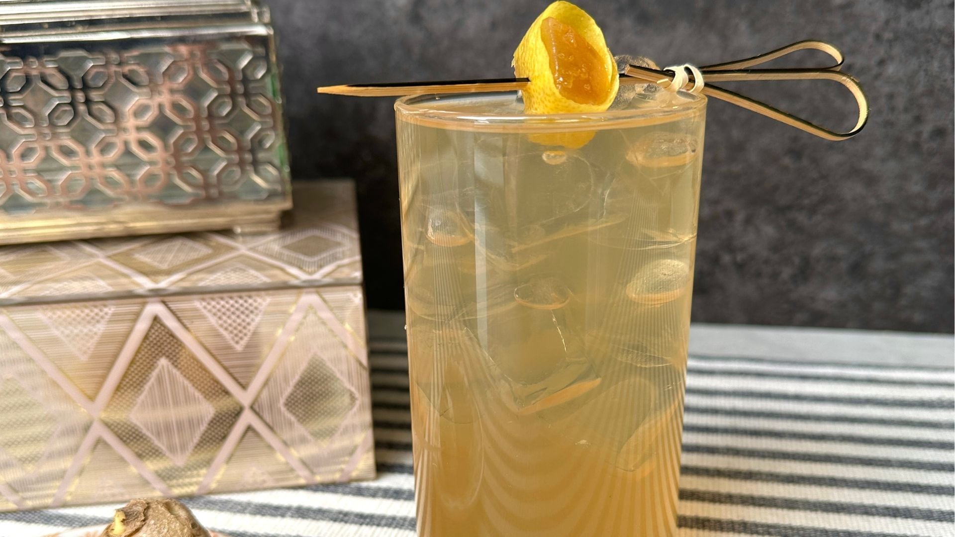 - Add rye, lemon, syrup, bitters to a highball with ice