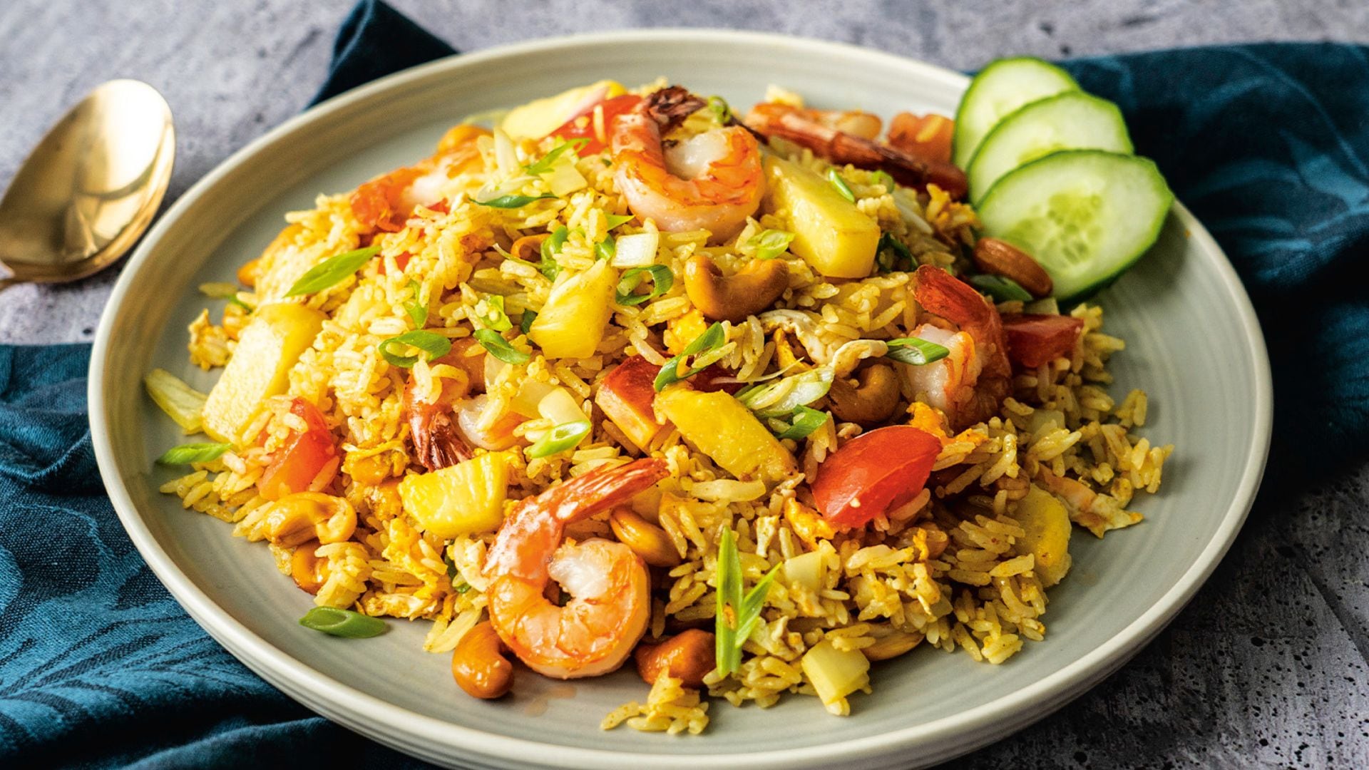 - Plate and top with the whole shrimp. Sprinkle over the reserved green onion for garnish. Serve with fresh cucumber slices to add freshness and crunchiness, and to balance out the richness of the fried rice.