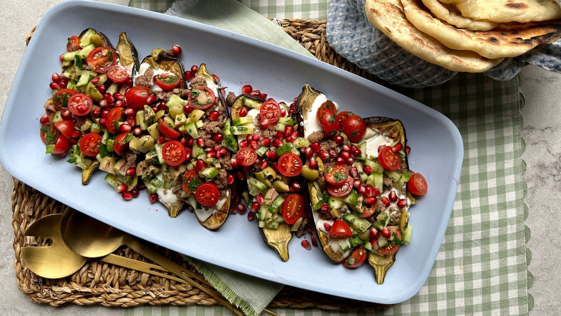 - To assemble, gently remove the eggplant from the parchment paper and place them skin side down on a large serving platter. Top each eggplant with a generous spoonful of the lemon yogurt, followed by the lamb, and the olive salad.