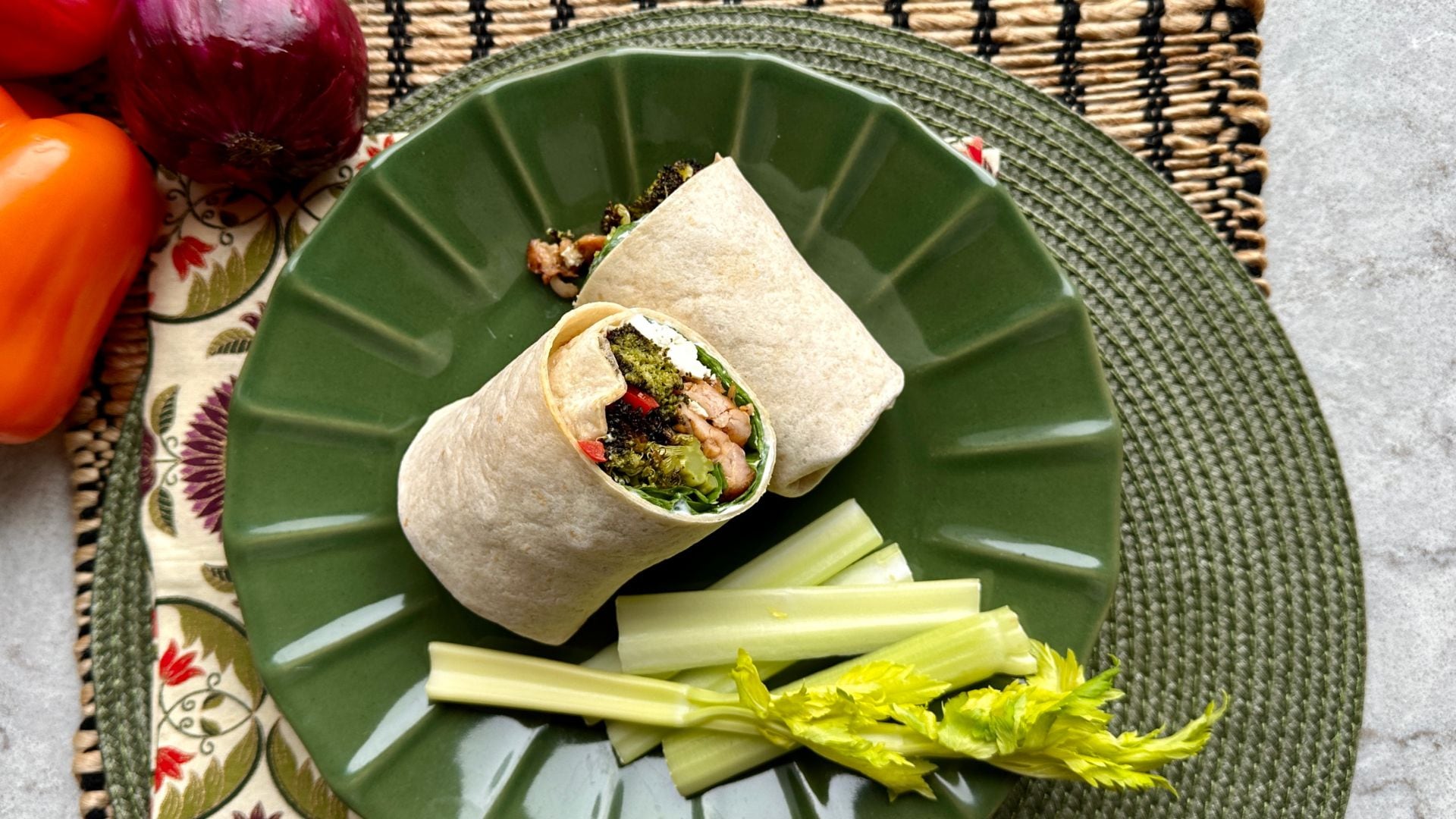 - Spread hummus or tzatziki down the center of the wrap. Add a handful of fresh greens, followed by warm roasted veggies. Top with shredded chicken, if using.