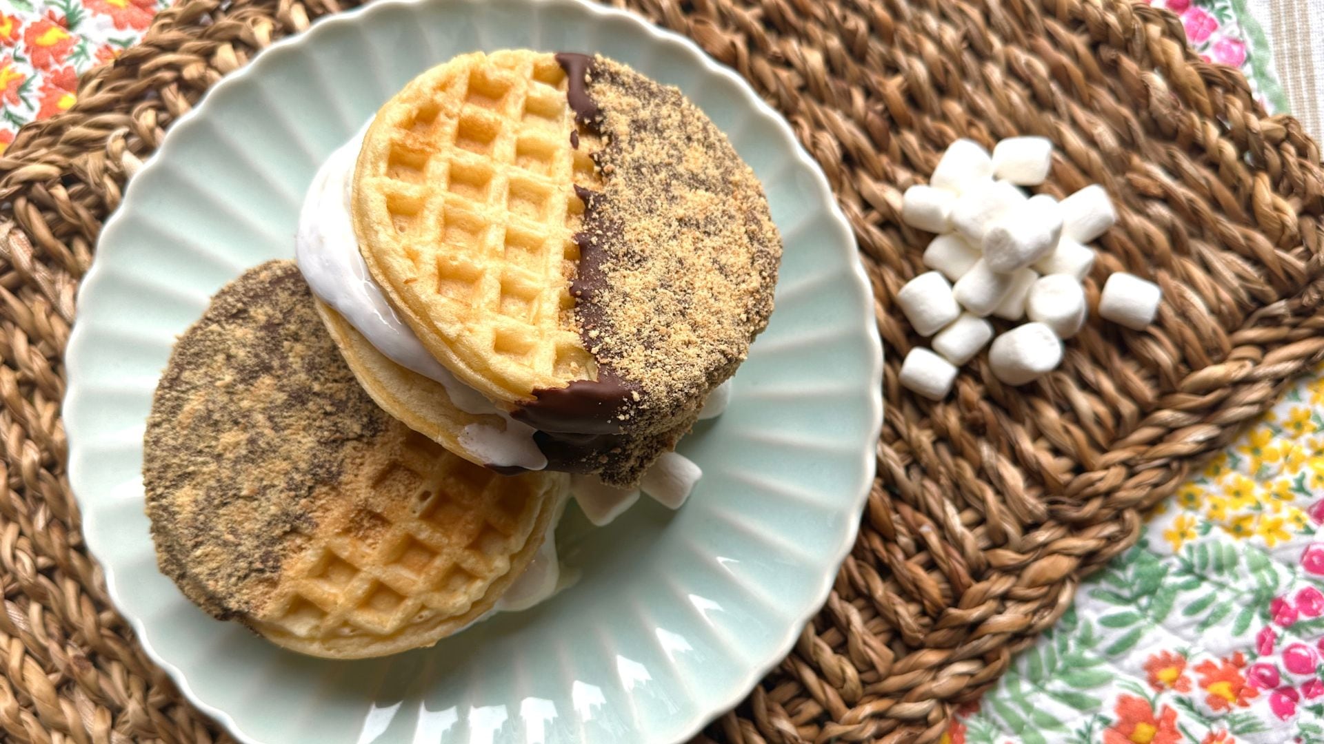 - Spread about 1 tablespoon marshmallow fluff on one waffle.