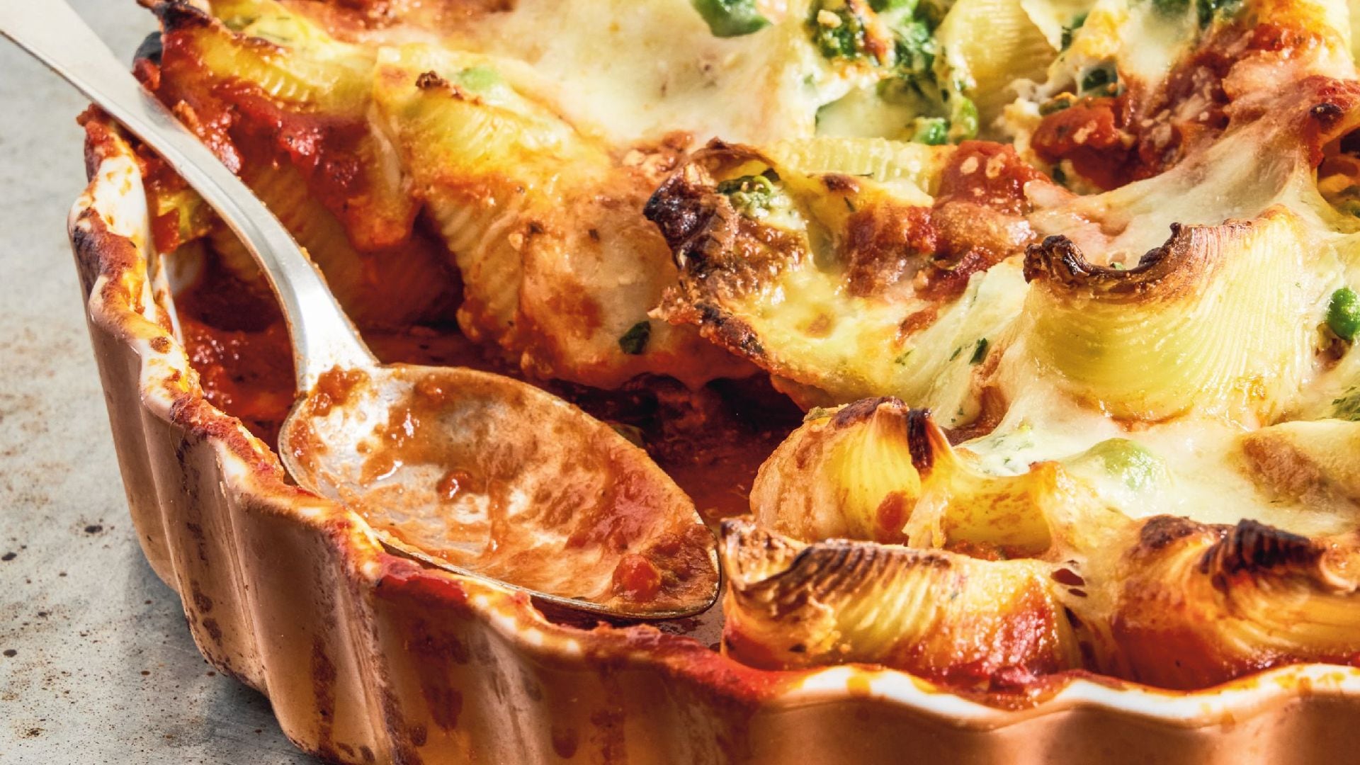 - To assemble, spread 2 cups of the sauce in the bottom of the baking dish. Divide the filling evenly among the shells, fill each shell (a small spoon works well), and arrange them in one layer in the baking dish (it’s okay to shingle them to make them flt). Top evenly with 2 cups more sauce. Sprinkle with the reserved cheese mixture. Dollop the remaining sauce evenly over the top. Tent with foil, and bake until it’s bubbly all over, 25 to 30 minutes. Remove the foil, and bake until the cheese is golden and crusty, 5 to 10 minutes more. Let the shells sit for 5 to 10 minutes before serving.