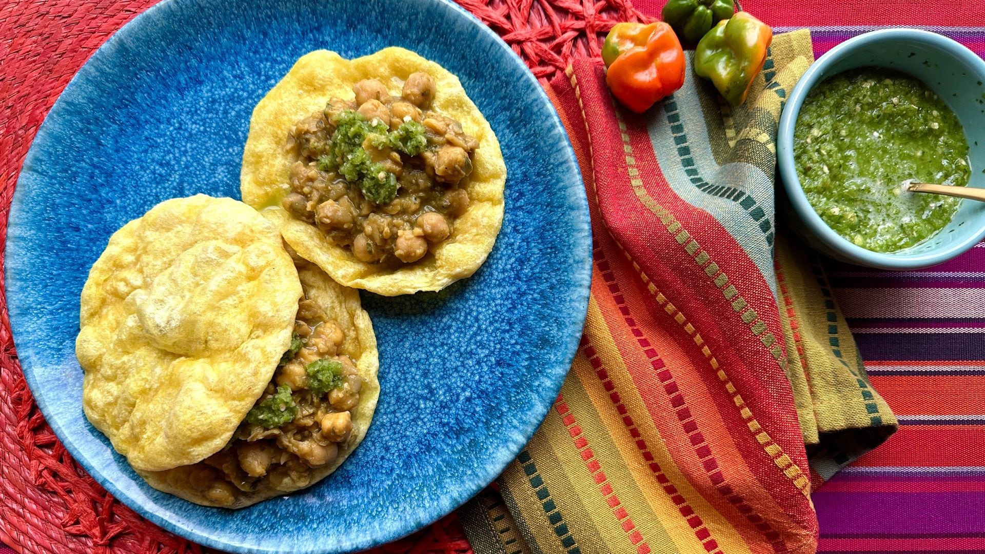 - To serve, place one piece of bara on a plate. Top with the chana and a bit of the pepper sauce. Top with another piece of bara. Serve hot.