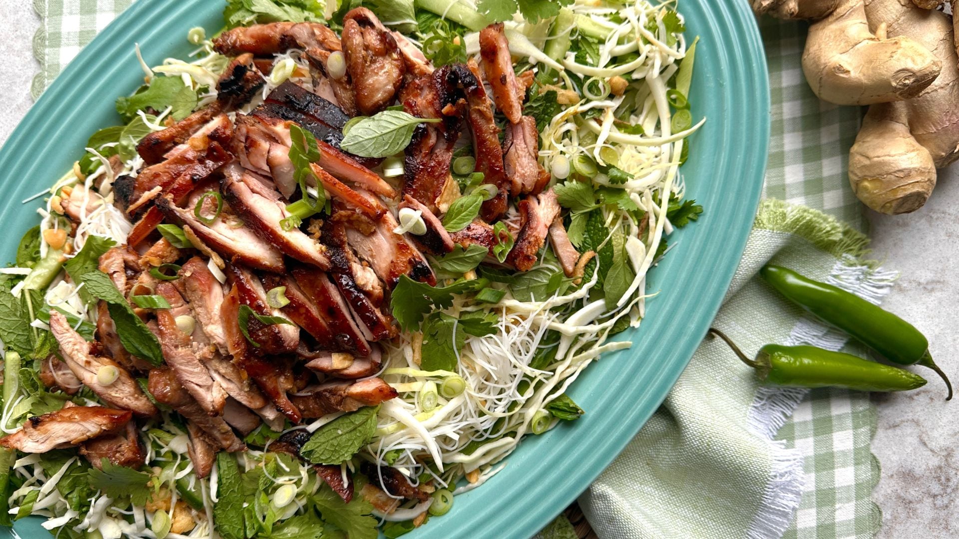 - Add cabbage, noodles, herbs, onion, cucumber and chili to a large bowl. Top with chopped chicken, drizzle with dressing and finish with peanuts and crispy shallots. Toss and enjoy immediately.