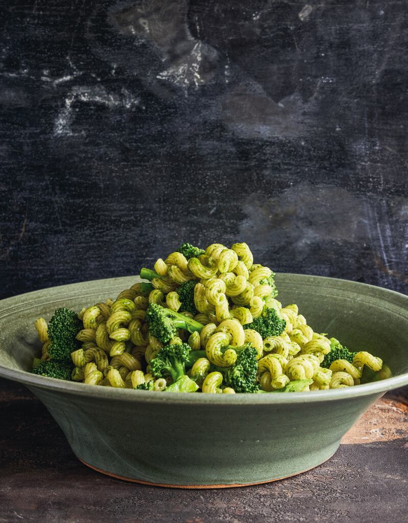 When pairing pastas with sauces, it’s important to think about how they’ll play off each other. Here, the pesto coats the cavatappi nicely, and the pieces of broccoli get hooked in the twists of each strand.