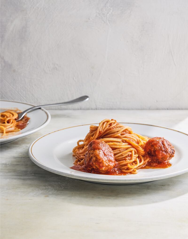 NOTE This makes enough sauce and meatballs for 2 pounds of pasta. I give directions for cooking half here, so freeze the rest for another time, or just make it all, with 2 pounds of pasta, for a big gathering.