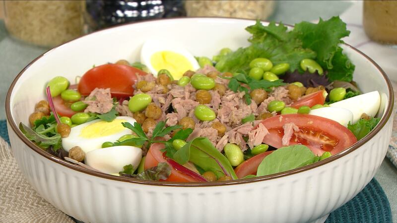 - Top with edamame, tuna, sliced eggs, and beans or chickpeas.