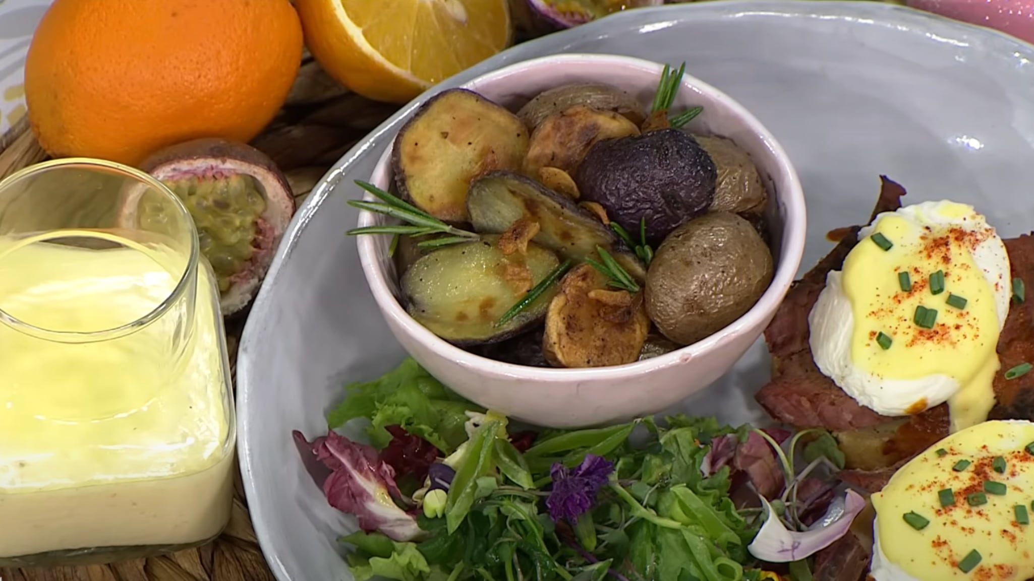 - Top each biscuit with a slice of brisket, then a poached egg, top with hollandaise sauce, paprika and chives.