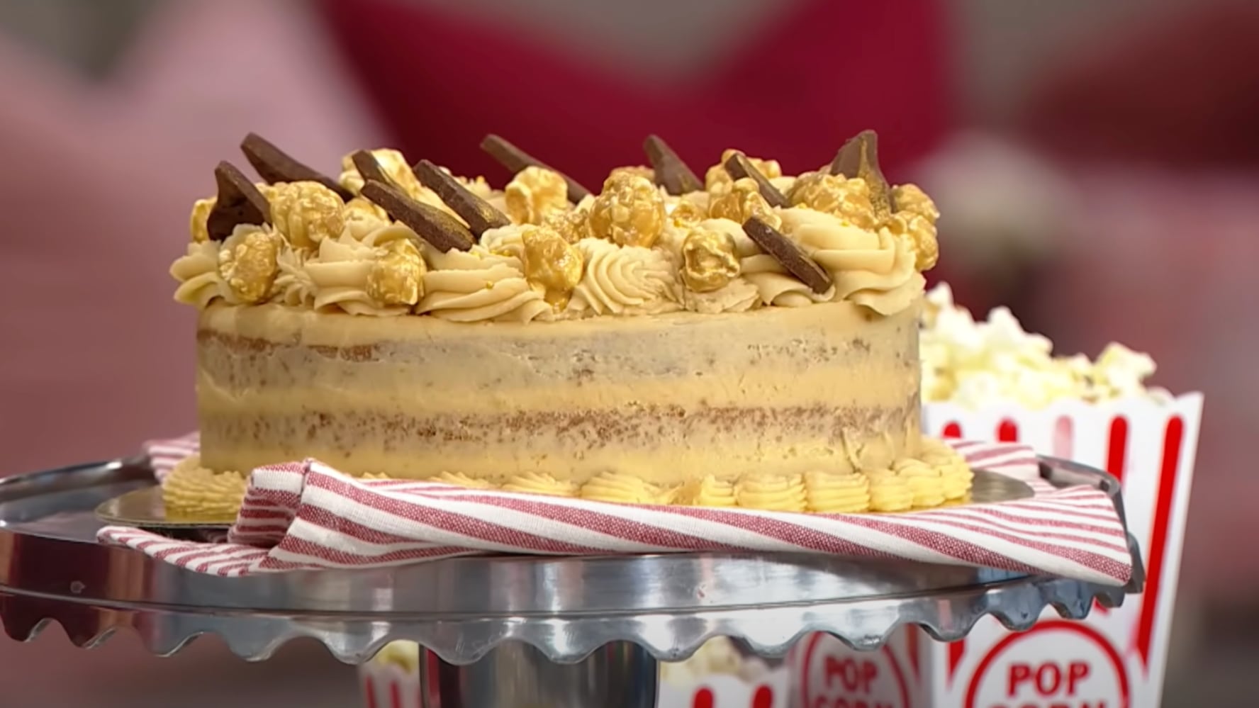 - Placed the second cake round on top and then frost the entire cake with buttercream. Decorate with more buttercream, drizzled caramel sauce, and caramel popcorn.