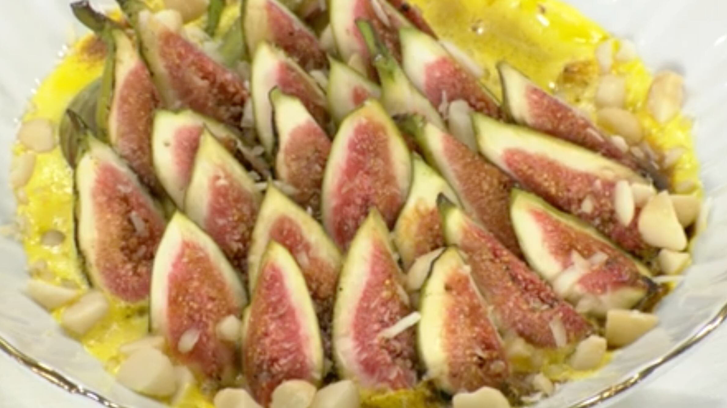 - To serve, pour the warm sauce in between the figs. Torch the figs one more time, garnish with the macadamia nuts, and serve.