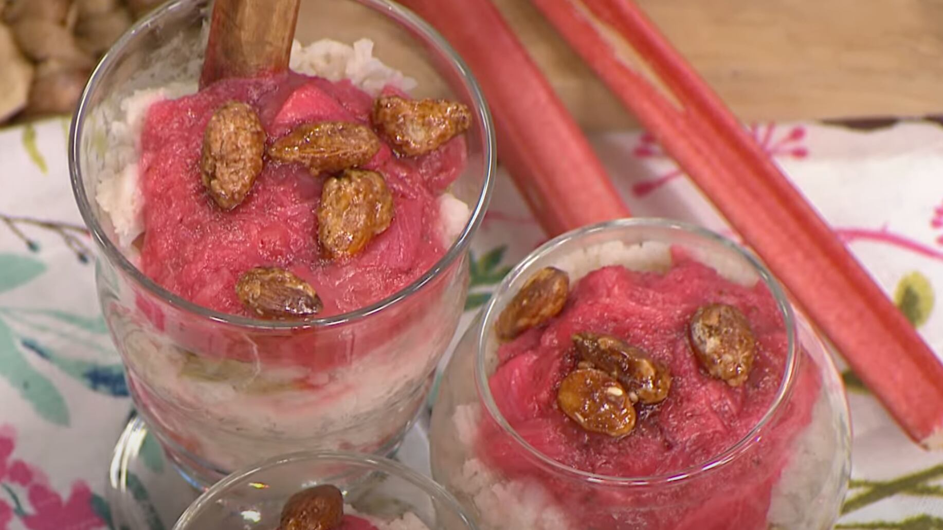 - In a saucepot, add all the ingredients for the Stewed Rhubarb except the vanilla. Bring to boil, reduce to simmer until you have a thick and sauce like consistency, about 15 minutes. Stir in vanilla.