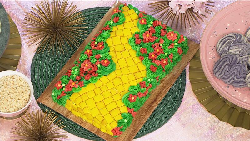 - Time to decorate your cake! Start by covering the cake in a thin layer of green frosting, then pipe on poppies, grass, and whatever else you like. Finish by laying down your yellow brick road cookies until your desired look is achieved.