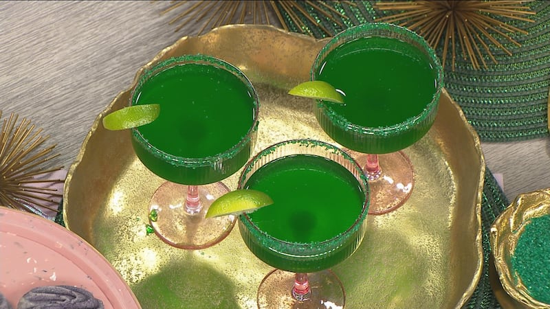 - Pour a thin, even layer of green sanding sugar onto a small plate. Run a lime wedge around the rims of your drinking glasses (about ¼ inch down the outside). Gently dip the moistened rim into the sugar, twisting slightly to coat evenly.