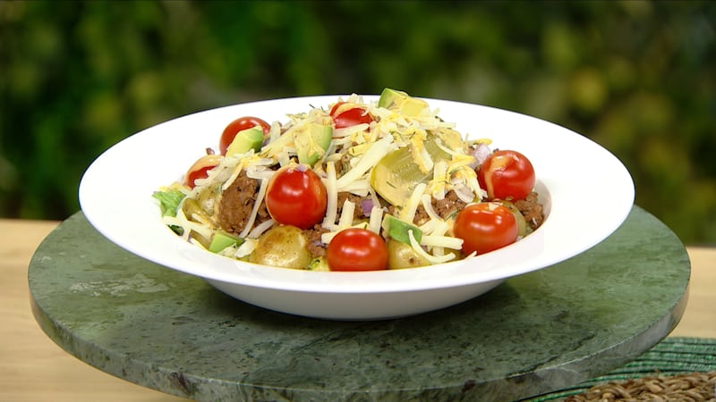 - To build your bowl, divide the romaine between four bowls. Add the potatoes, meat mixture and other veggies. Drizzle with a couple spoonfuls of sauce and enjoy warm.