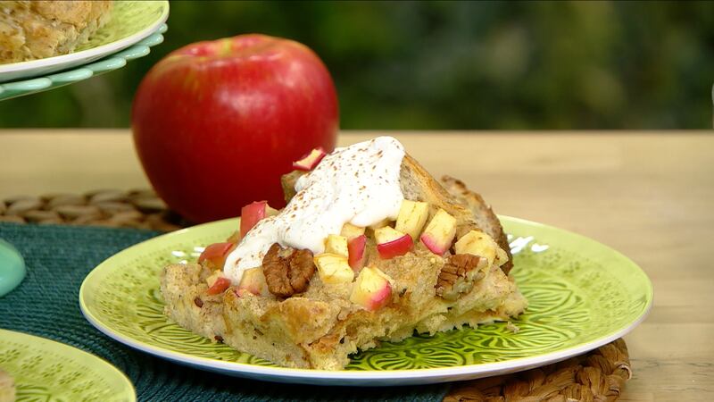 - Sprinkle the apple pieces and pecan halves over the bread and press firmly down into the bread pieces. Bake for 45-50 minutes or until lightly browned. Allow to set up for 5 minutes before serving as desired with yogurt, extra pecans and/or maple syrup.