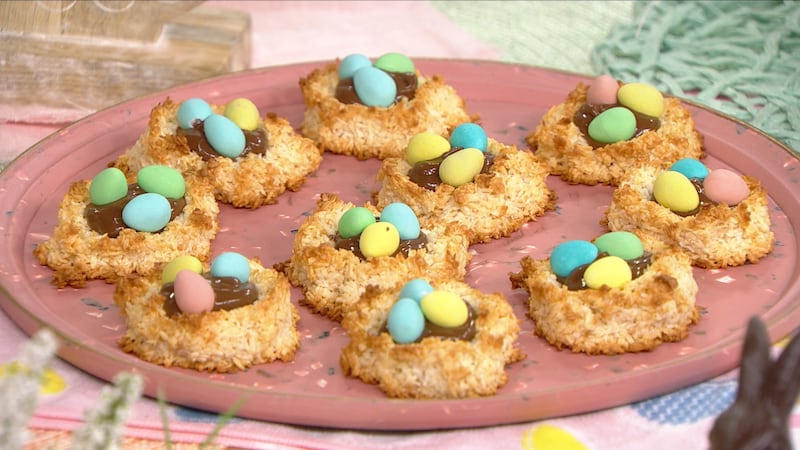 - Pipe about a tablespoon of chocolate spread in the centre of each nest. Place 3 egg candies in the centre of the nest. Finish decorating the remaining nests and serve.