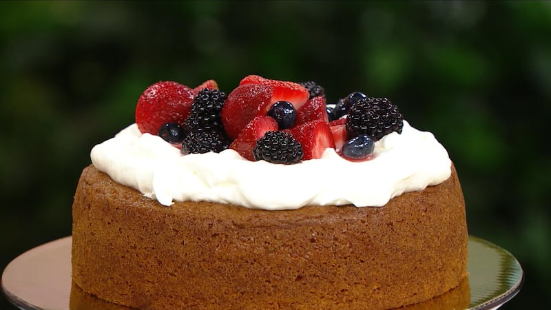 - Assemble cake: Place cake on serving plate or cake board. Top with a loose mound of whipped cream. Add swoops to the whipped cream using a spoon. Spoon your macerated berries on top of the whipped cream. Top with fresh thyme leaves as a garnish. Slice and enjoy!