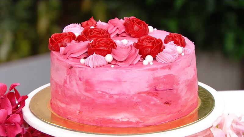 - After you have placed your final cake round on your stack, frost the entire cake with buttercream and decorate with desired toppings and decorations (piped roses, edible rose petals, raspberries, etc.)