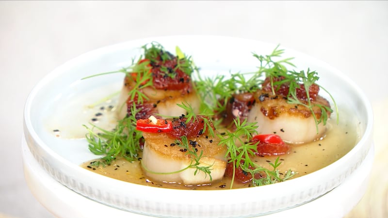 - Plate the scallops. Top with the blood orange mix, sprinkle more Urfa if desired and garnish with fresh herbs and red onion.