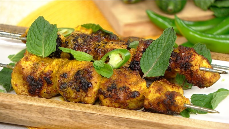 Grilled Amba Chicken Skewers with Mint & Red Onion